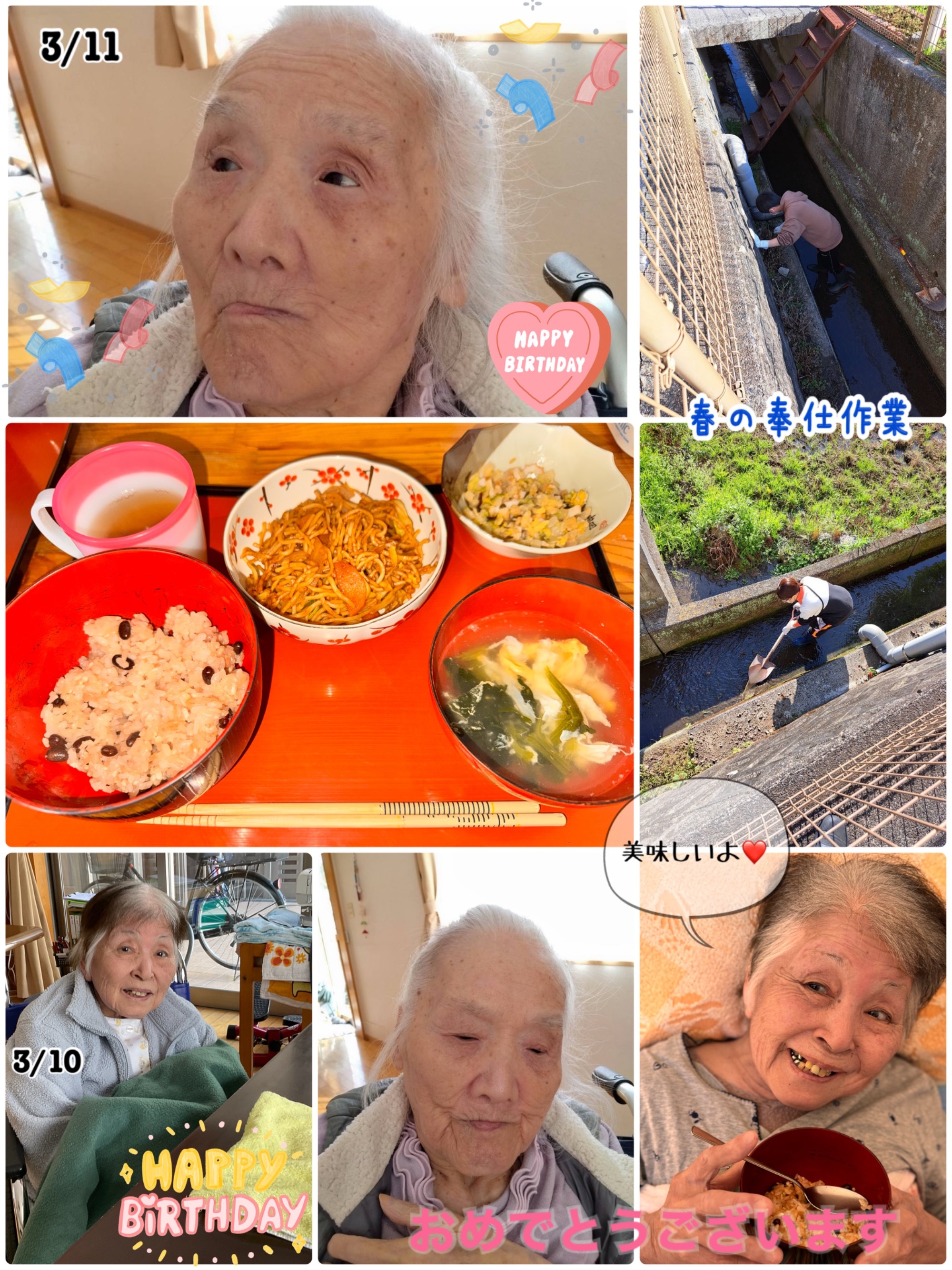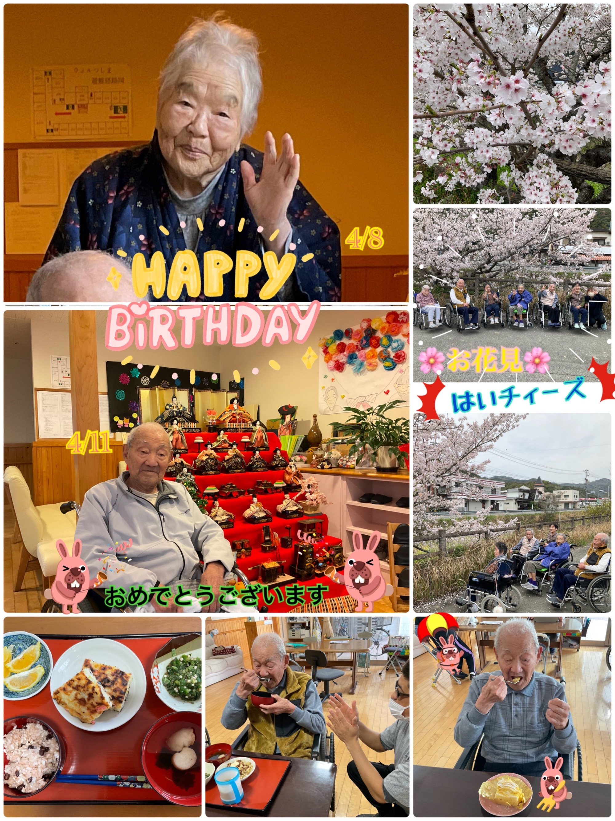 桜の花が満開のときにお2人の方のお誕生日お祝いを行いました。お赤飯をお出しすると「戦争じぶんにはちんちまんまは食べれなんだ、今は幸せよ」と話していただきました。戦後80年が経過して戦争を体験された貴重な方のお話でした。